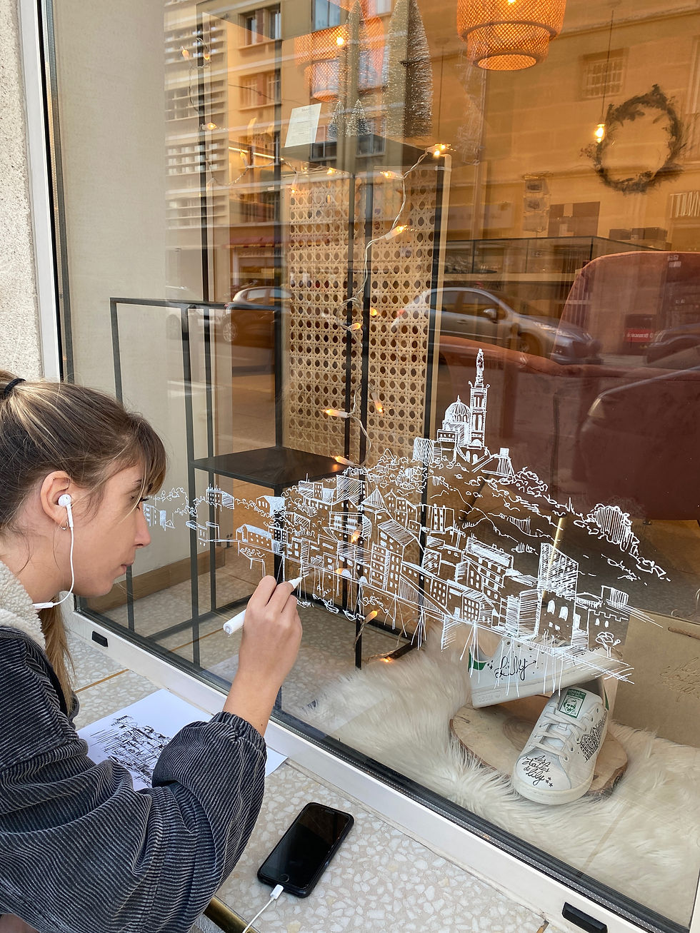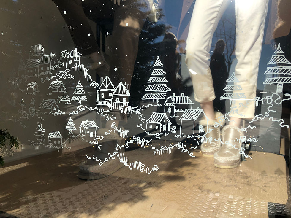 Les décorations sur vitrine sont uniques et s'inspirent des paysages locaux. Elles sont éphémères et sont réalisées dans votre établissement à main levée au posca (peinture à l'eau) en blanc ou en couleurs.
